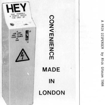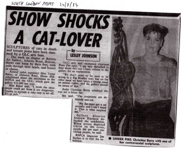 Most people who saw these cartoon kitties, made of foam and leatherette and decorated with stylised punk bondage gear, found them amusing but, one person didn’t. She seemed to think it was an incitement to animal cruelty and so got the local paper to run a critical article. The tabloids ran the story as ‘Gallery gets GLC funding for cat torture exhibition’, some animal activists smashed one of our windows and we very nearly lost our grant funding.
